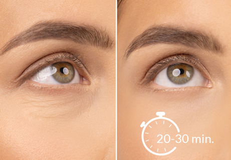 Naamion koostumus sisältää kollageenia, retinolia, keramideja ja C‑vitamiinia jotka tarjoavat kokonaisvaltaisia nuorentavia ja ravitsevia hyötyjä. Jo ensimmäisestä käyttökerrasta lähtien iho on syväkosteutettu, sileämpi ja kiinteämpi. Säännöllinen käyttö auttaa vähentämään tummia silmänalusia ja turvotusta, parantaa kiinteyttä ja kirkastaa silmänympärysaluetta, antaen näkyvästi nuoremman ja levänneemmän ilmeen, joka on verrattavissa meso- tai Carboksi-terapian tuloksiin.